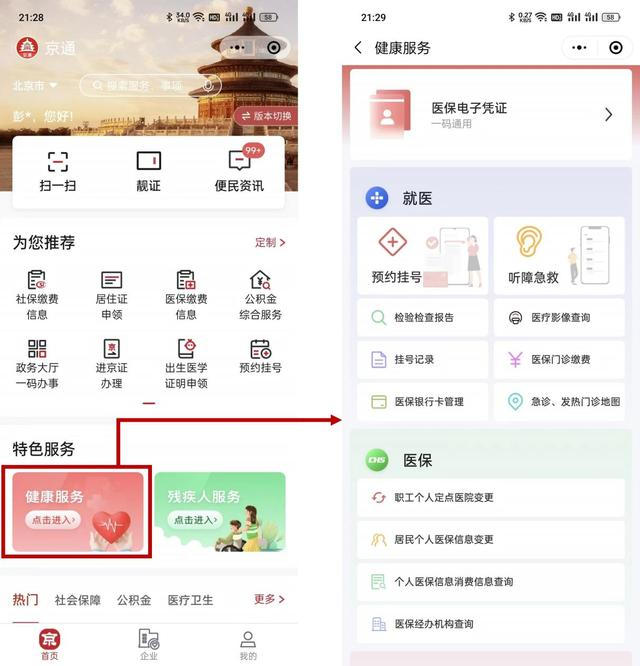 为丰富医疗健康服务内容,提升市民看病就医体验,新版“京通”小程序对首页“健康服务”专题进一步完善升级。新专题包含“就医”“医保”“药品”“防疫”“科普”5个板块20余项服务,可一站式查找使用。值得关注的是,新版小程序中,市民可以在“就医”板块,获取预约挂号、医保门诊缴费、报告查询等诊前、诊中、诊后所需服务。目前,北京26家医院开通了医保移动支付服务,医保用户通过“京通”小程序微信端和支付宝端,即可完成挂号、门诊费用缴纳。