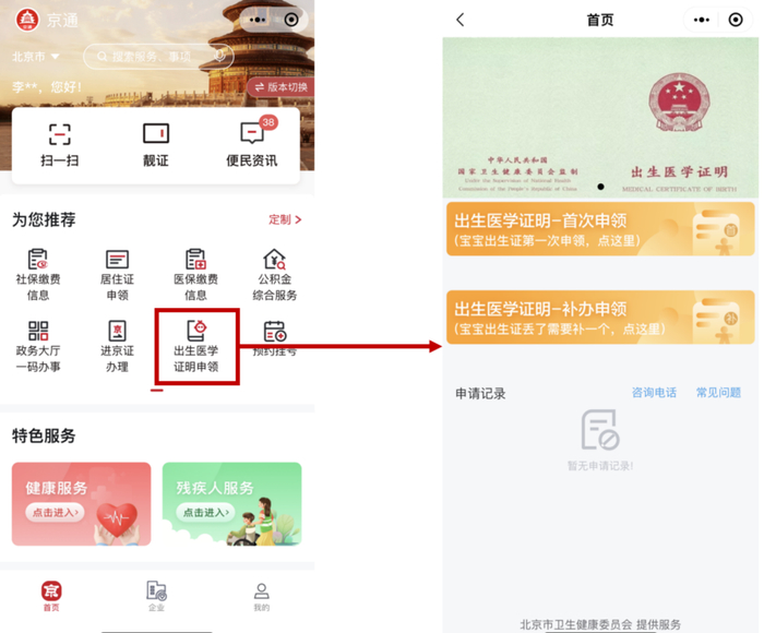 如何足不出户就能完成出生医学证明申领?新生儿父母可在“京通”小程序首页搜索或点击推荐栏目“出生医学证明申领”进入该服务,核对新生儿信息、上传有效证件。官方审核确认后,出生医学证明即可被邮寄到家。