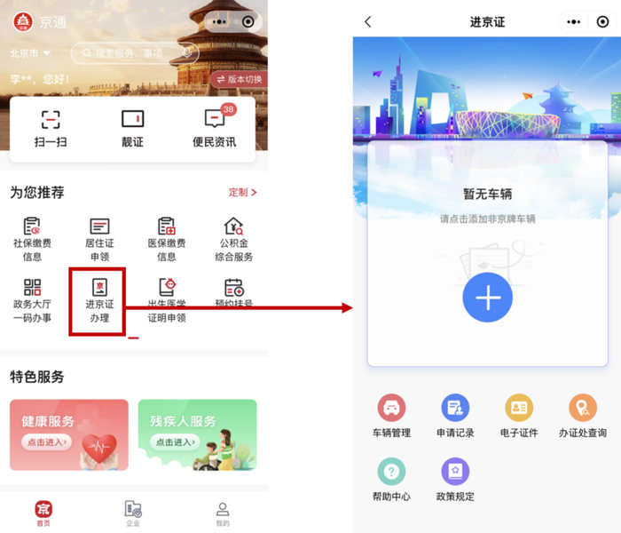 外地号牌机动车进京怎么办?您可以在“京通”首页搜索或者点击推荐栏目“进京证办理”添加非本市机动车车辆信息,选择“进京证”类型(六环内或六环外),填写驾驶员、同行人员、进京相关信息,在线快速申请办理进京证。