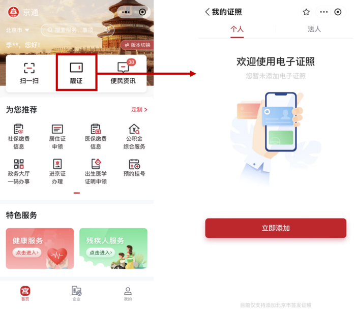 线下办事忘带证件?不要着急,“京通”小程序“靓证”功能接入了北京市签发的35类个人电子证照和45类法人证照,如居民身份证、居民户口簿、机动车行驶证、不动产登记证明等。