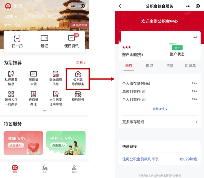 想了解自己的公积金信息?在“京通”小程序首页搜索或点击推荐栏目“公积金综合服务”,即可查询本人住房公积金缴存、提取、贷款和对账单等信息,还可在线办理住房公积金提取、住房公积金贷款、调整月还款额等业务。