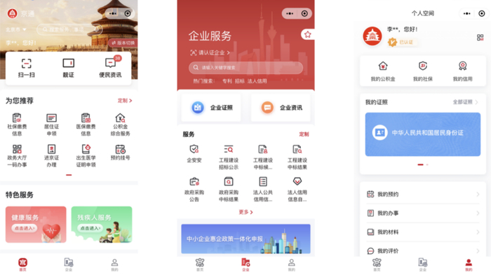 “京通”小程序由“首页-企业-我的”三个页面组成,“首页”提供个人服务及区级服务,“企业”页面汇聚知识产权、公共资源、设立变更、助企惠企等7个板块的企业服务,企业经常使用的“企安安”“法人公共信用报告”“专精特新”系列服务等,都可以在该页面找到。