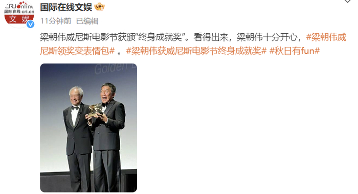 梁朝伟威尼斯电影节获颁“终身成就奖”。看得出来,梁朝伟十分开心。