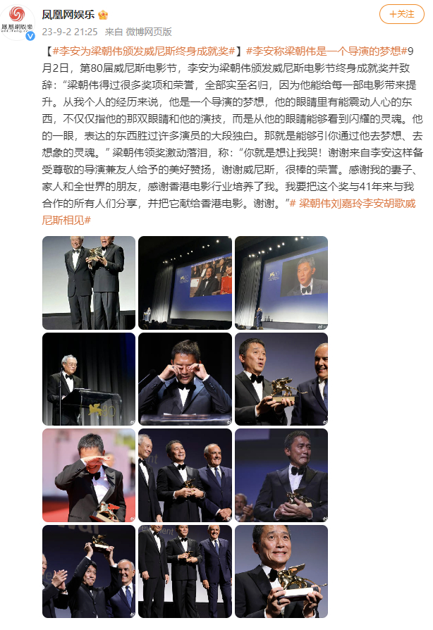 9月2日,第80届威尼斯电影节,李安为梁朝伟颁发威尼斯电影节终身成就奖并致辞:“梁朝伟得过很多奖项和荣誉,全部实至名归,因为他能给每一部电影带来提升。从我个人的经历来说,他是一个导演的梦想,他的眼睛里有能震动人心的东西,不仅仅指他的那双眼睛和他的演技,而是从他的眼睛能够看到闪耀的灵魂。他的一眼,表达的东西胜过许多演员的大段独白。那就是能够引你通过他去梦想、去想象的灵魂。”