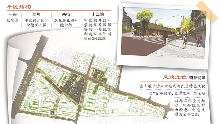 据邹莺介绍,耿家巷崇德里历史文化风貌片区结构为“一带串两片,两街十二院”,“一带”即耿家巷,汇聚成都清代、民国、近代与当代特色建筑的特色商业带。