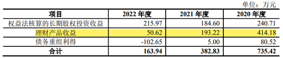 2020年-2022年,汉兴能源交易性金融资产余额分别为3,750万元、3,900万元、0万元,主要系购买的银行理财产品。而汉兴能源的理财产品收益各期分别为414.18万元、193.22万元、50.62万元。