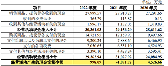 据乐居财经《预审IPO》穿透招股书了解,2020年-2022年,汉兴能源的经营活动现金流量净额分别为4,526.66万元、-1,871.72万元、998.09万元,波动较大。截止2022年底,账面货币资金为2.67亿元,相比2021年的3.09亿元,下滑约13.59%。