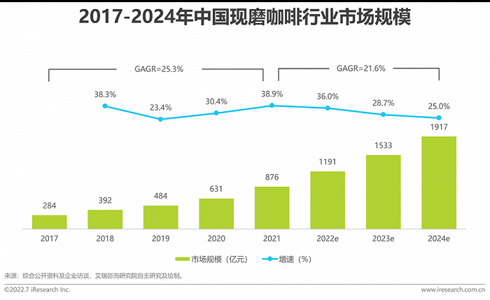 根据第三方调研报告,国内咖啡行业预计未来几年将保持平均27.2%的增长率,到2024年现磨咖啡市场规模有望达到1900亿元。