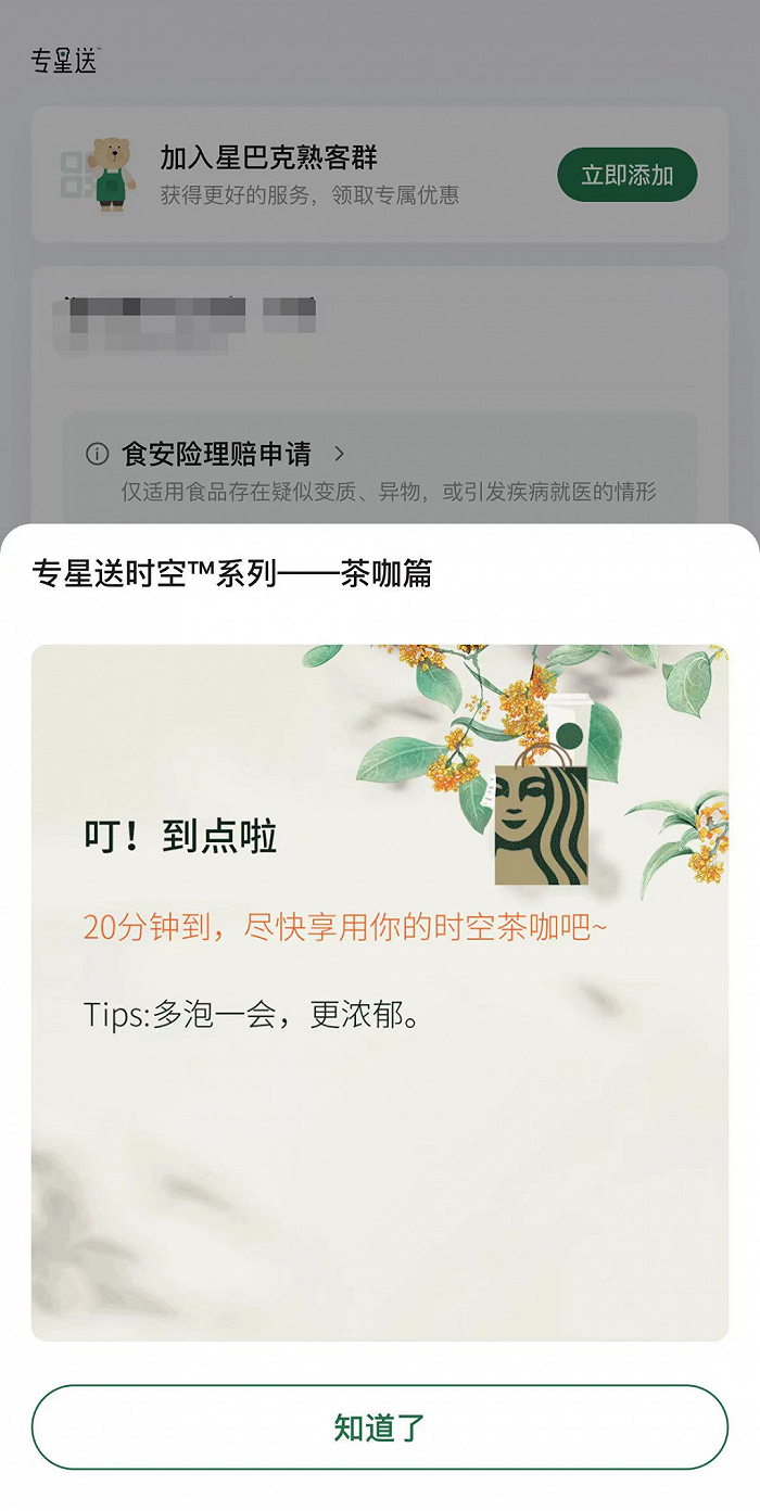 从产品运营的角度来看,专星送本轮操作亦有可圈可点之处。作为全球零售巨头,精细化运营不是一句口号,处处皆细节。比如专星送上会出现专属的计时模块,从饮品制作完毕开始计时,20分钟后自动提醒顾客已达到适宜享用的状态。这种巧思不仅提升了喝咖啡的仪式感、氛围感,也把顾客与饮品的连接提前了。