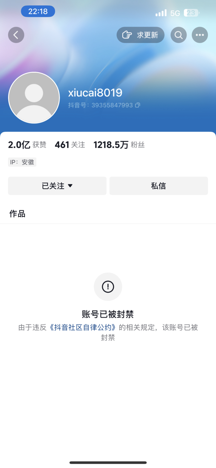 据新京报报道,日前抖音获赞达2亿,粉丝超1200万粉丝的“大妈杀手”的主播“秀才”的账号被封禁。