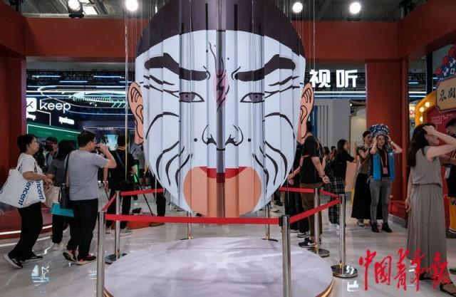 9月2日,北京首钢园,2023年中国国际服务贸易交易会文旅服务展区,京剧国粹展位,一座巨大的脸谱装置。中青报·中青网记者 张玉佳/摄