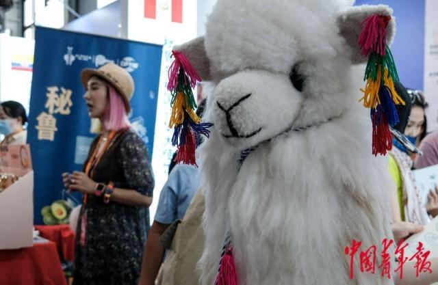 9月2日,北京首钢园,2023年中国国际服务贸易交易会文旅服务展区,第八届“炫彩世界”——“一带一路”沿线国家特色文化展示活动上,秘鲁展位的品牌公仔“精灵驼”,“精灵驼”的设计灵感来自秘鲁的“神兽”——羊驼。中青报·中青网记者 张玉佳/摄