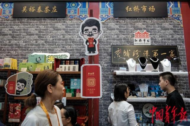 9月2日,北京首钢园,2023年中国国际服务贸易交易会文旅服务展区,吴裕泰品牌的展位上挂着动漫IP形象“老吴”。中青报·中青网记者 张玉佳/摄