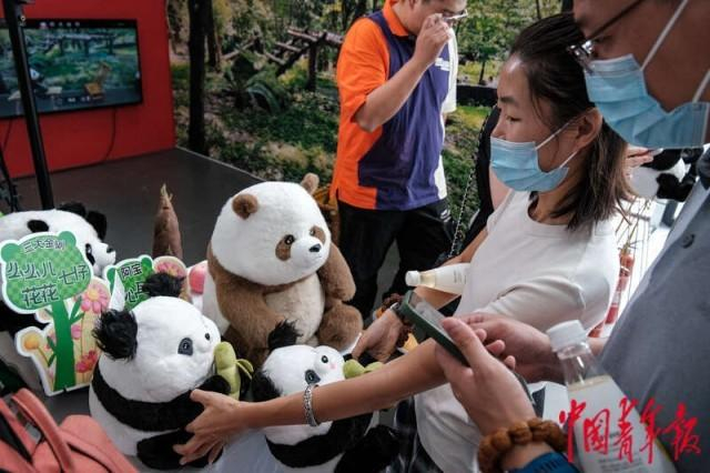 9月2日,北京首钢园,2023年中国国际服务贸易交易会文旅服务展区,参观者正在选购熊猫公仔,这些公仔的原型大多来自于“网红”熊猫花花、七仔、萌兰等。中青报·中青网记者 张玉佳/摄