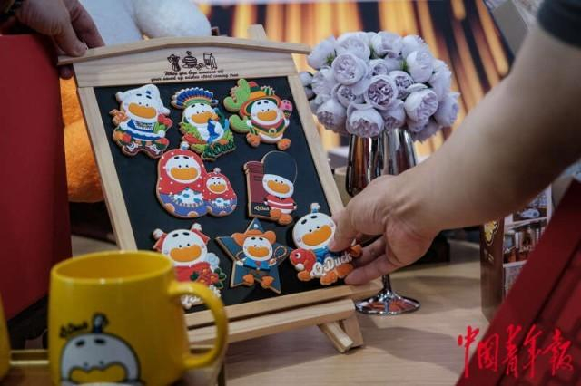 9月2日,北京首钢园,2023年中国国际服务贸易交易会文旅服务展区,参观者选购全聚德品牌的动漫IP“萌宝鸭”周边。中青报·中青网记者 张玉佳/摄