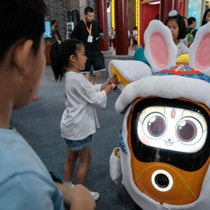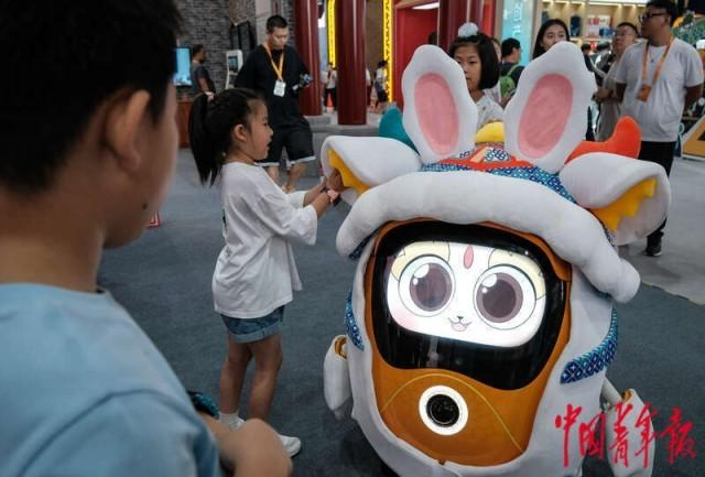 9月2日,北京首钢园,2023年中国国际服务贸易交易会文旅服务展区,几名小朋友正在与东城区文旅品牌动漫IP机器人“麒东东”互动。文旅服务展馆集结了卡通IP、文创周边、传统工艺、非遗体验及各国文化产品等,现场人流涌动,十分火爆。