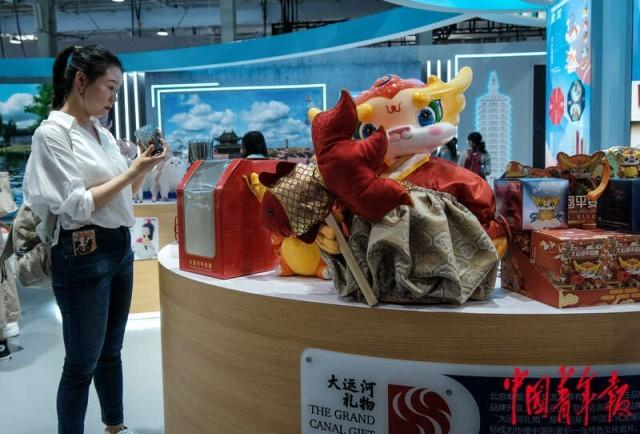 9月2日,北京首钢园,2023年中国国际服务贸易交易会文旅服务展区,京杭大运河的动漫IP公仔“阿平”。中青报·中青网记者 张玉佳/摄