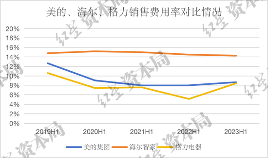 具体来看,导致海尔净利率过低的主要原因,在于企业销售费用率非常高。财报显示,今年上半年,美的、海尔、格力的销售费用率分别为8.7%、14.3%、8.4%,海尔的销售费用率远高于同行。