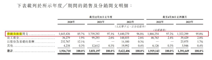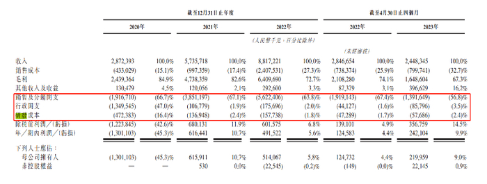 招股书显示,2020年-2023年4月,中旭未来营销及推广费用分别为16.43亿元、37.39亿元、54.40亿元、13.22亿元。而这些费用主要用于合作网上媒体平台的网上流量获取费、线下营销开支及明星代言费。