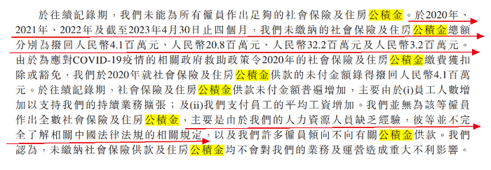 然而,令人疑惑的是——既然公司资金如此充裕,却为何独独亏待了员工?招股书显示,2020年-2023年4月,公司未缴纳的社会保险及住房公积金总额分别为拨回410万元、2080万元、3220万元及320万元。(2020年的拨回款项是由于疫情原因而享受的相关政府救助政策)