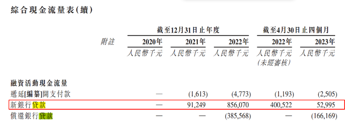 招股书显示,2020年-2023年4月,中旭未来从银行获得的新贷款分别为0、9124.9万元、8.56亿元、5299.5万元。