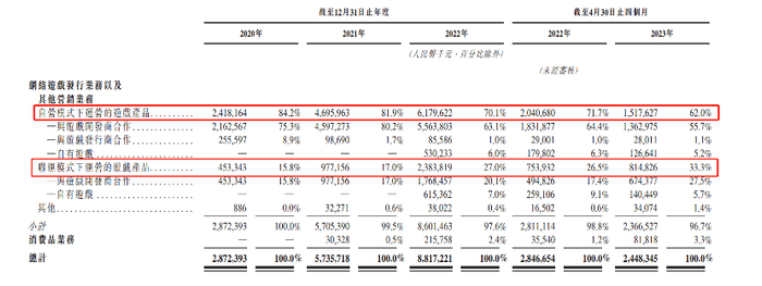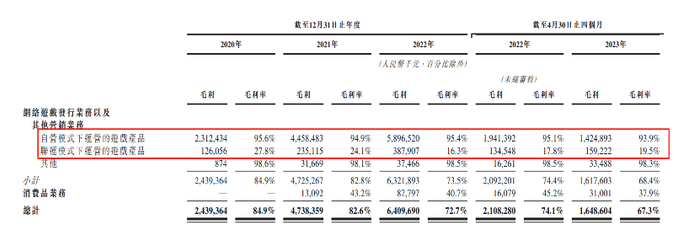 相比于自营游戏,联营游戏的毛利率过低。招股书显示,2020年-2023年4月,自营游戏的毛利率分别为95.6%、94.9%、95.4%、93.9%;联营游戏的毛利率则低至27.8%、24.1%、16.3%、19.5%。