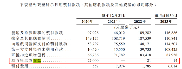 2020年-2023年4月,营销及推广服务的预付款分别为9792.6万元、4601.2万元、1.09亿元、1.17亿元;向游戏开发商支付的预付款分别为5379.7万元、7555.9万元、1.48亿元、1.75亿元。