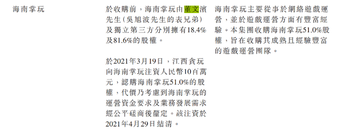 值得注意的是,在收购前,海南掌玩由吴旭波的表兄弟董文滨持股18.4%。