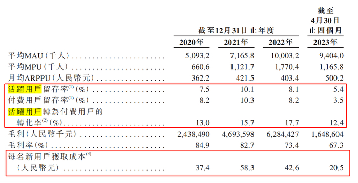 招股书显示,2020年-2023年4月,活跃用户留存率分别为7.5%、10.1%、8.1%、5.4%;付费用户留存率8.2%、10.3%、8.2%、3.5%;活跃用户转为付费用户的转化率分别为13%、15.7%、17.7%、12.4%。
