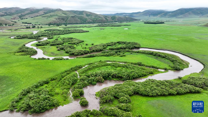 7月5日拍摄的乌兰毛都草原夏日风光(无人机照片)。夏日时节,位于内蒙古自治区兴安盟科尔沁右翼前旗的乌兰毛都草原绿草如茵,景色宜人。新华社记者 贝赫 摄