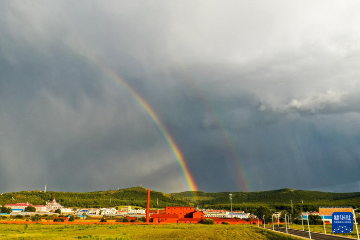 这是8月31日拍摄的阿尔山市的彩虹(无人机照片)。初秋时节,内蒙古自治区兴安盟阿尔山市秋意渐浓,景色宜人。新华社记者 连振 摄
