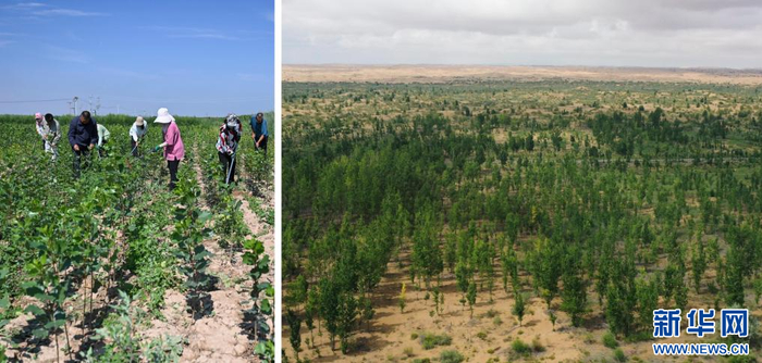 这是一张拼版照片。左图为内蒙古杭锦旗什拉召治沙站的工作人员在苗圃中除草(7月22日摄);右图为内蒙古杭锦旗什拉召治沙站种植的库布其沙漠锁边林(7月22日摄,无人机照片)。20世纪50年代开始,国营林场什拉召治沙站开始植树治沙,三代治沙人在库布其沙漠北缘营造了长48公里、面积12万多亩的锁边林带,有效遏制了沙漠向北扩张。新华社记者 刘磊 摄