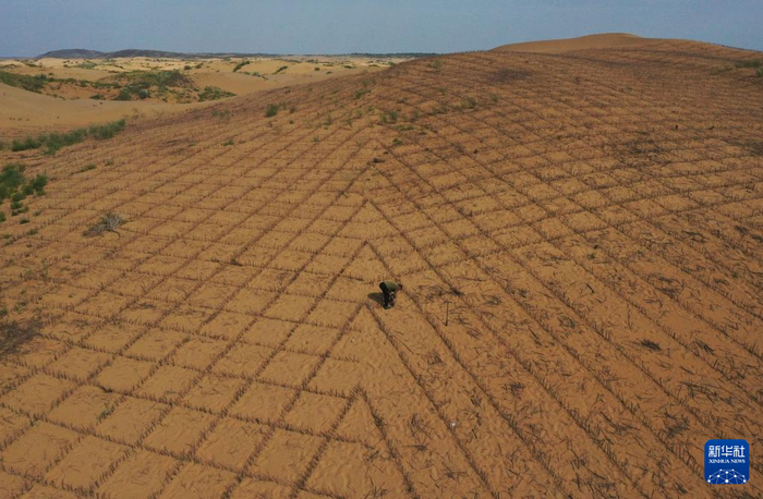 8月11日,工人在达拉特旗境内的库布其沙漠中栽设沙障(无人机照片)。为进一步加强荒漠化综合防治,当地政府织干部群众、治沙工人深入库布其沙漠栽设沙障,防风固沙。新华社记者 刘磊 摄