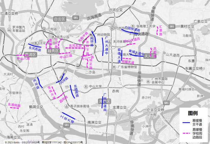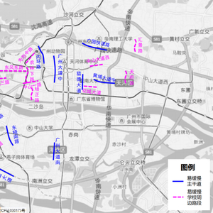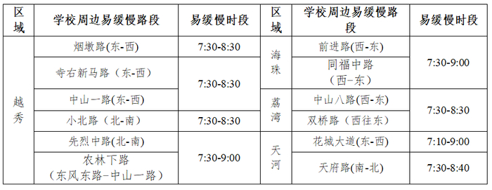 局部交通方面,环市路、黄埔大道、广州大道、东风路、内环路(动物园路段)等中心城区重要干道高峰时段车流量较大,另外,教学资源丰富的东风东路、中山一路、先烈中路等路段及周边区域容易出现短时车流集中的情况,部分学校周边路段受路面资源限制路宽相对较窄、车道数较少等因素影响,在送学高峰时段车速或低于20公里/时。