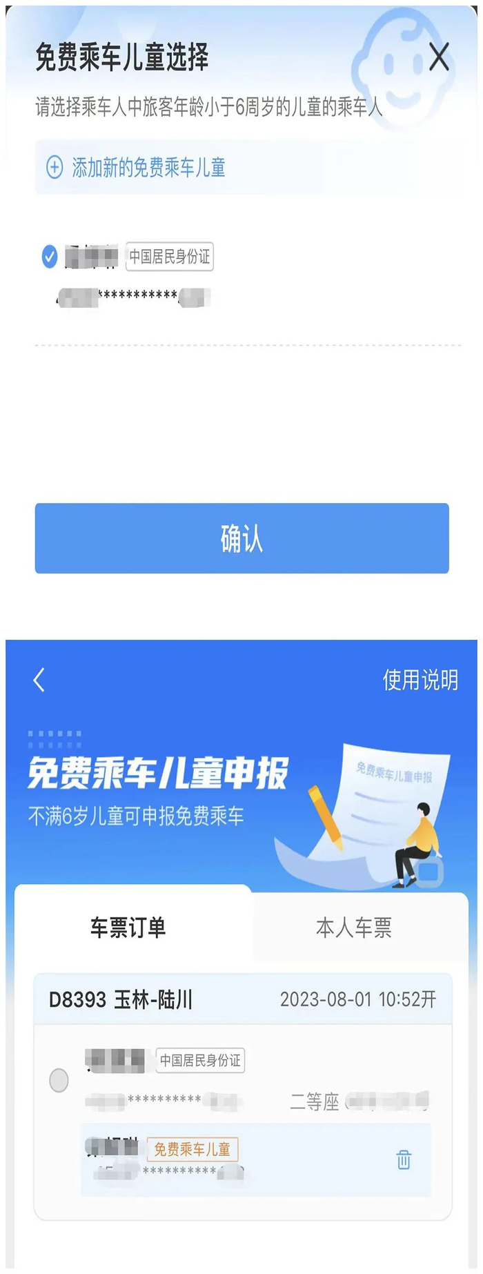 选择免费乘车儿童并点击“确认”,即可完成申报。