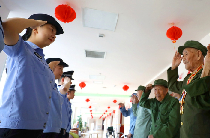 9月3日,山东省沂南县抗战老兵照护中心,青年民警向抗战老兵敬礼。