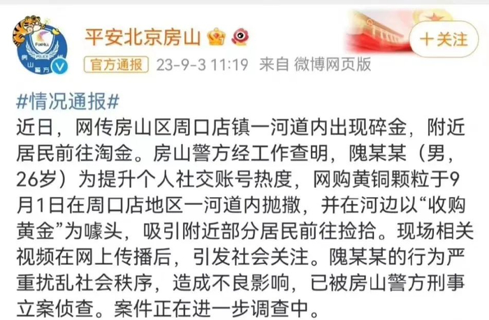 河道有黄金?近日,网传房山区周口店镇一河道内出现碎金,附近很多居民前往拾捡。9月3日,房山警方发布通报称,隗某某(男,26岁)为提升个人社交账号热度,网购黄铜颗粒于9月1日在周口店地区一河道内抛撒,并在河边以收购黄金为噱头,吸引附近部分居民前往捡拾。警方已刑事立案,案件正在进一步调查中。
