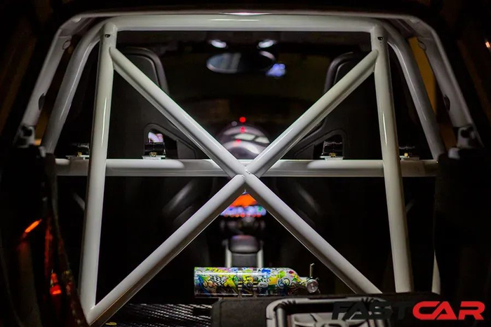 此外还有Alcantara材质仪表板,以及一系列碳纤维材质的覆盖部件,他扔掉了无用的车后座,并定制了一套TIG焊接防滚架来代替,简直就是完美。