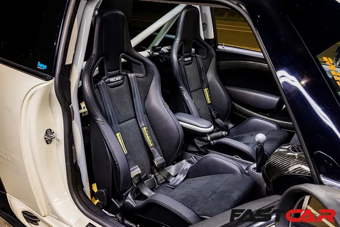 接下来则是内饰部分,Ronnie真的是煞费心思让这台车看起来十分特别。比如他之前试图找一套JCW Recaro Sportster座椅,但预算不允许,因此我买了一套常规的Recaro Sportster CS座椅以及Schroth四点式安全带。