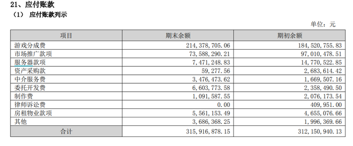 而从公司当期的应付账款情况来看,在众多的应付款细分项目中,截至2023年6月30日,公司最大的应付款细分项目为游戏分成费,高达2.14亿元,其次为市场推广项目的应付款,达到了7358.83万元。