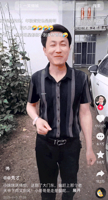 秀才的视频场景多选在乡村,梳的精致油头,穿西装或衬衫,每当镜头靠近时,秀才就会微笑、撩头发,同时对口型开始唱歌。“秀才”爆红后,不少网友将称其为“低配靳东”“靳东平替”。