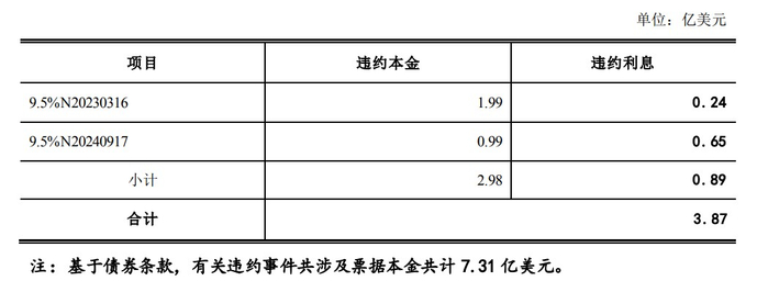 因宏观经济环境、行业环境及融资环境叠加影响,公司流动性紧张,已暂停对上述票据的支付。截至 2023 年 6 月 30 日,上述美元债的具体违约本金及利息情况如下: