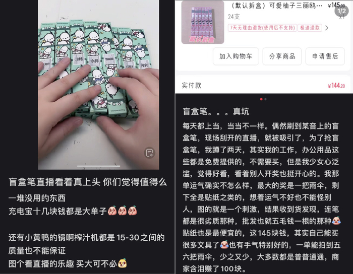 有网友表示,这类直播看着十分过瘾解压,看到他人刮到的商品精美超值,自己也忍不住下单,没中奖就当是买文具了。然而,也有不少消费者抱怨,其根本上就是营销噱头、骗局,盲盒笔刮出的商品质量差、价格低,这些商品看似物超所值,但实际上质量低劣,根本不敢使用。
