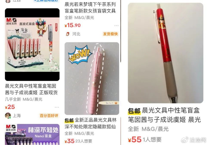 法治网研究院注意到,除文具店的线下销售外,线上营销文具盲盒以及二手平台上的转卖也十分普遍,其价格更是惊人,比如一款同样功能的中性笔,其指定款和隐藏款,竟然高达四五十元,超过普通款价格的数十倍。