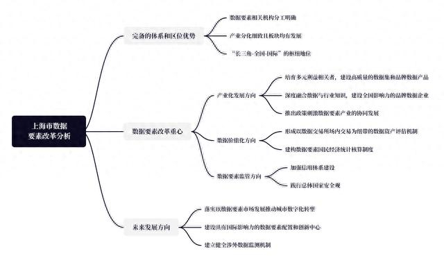 首先上海市有众多分工明确的数据要素机构,如长三角地区政务数据共享平台,上海数据交易所,上海市企业数据中心等,为建立数据要素收集和开放提供了良好的条件。其次,上海市政府注重产业化建设,注重金融、航运、商贸物流、科技、制造业等重点板块发展建设,培育通信、医疗、交通、能源、信用等特色板块,产业分化丰富。最后,上海在数据要素改革中地位特殊,形成了由长三角到全国性枢纽再面向世界的数据要素格局。