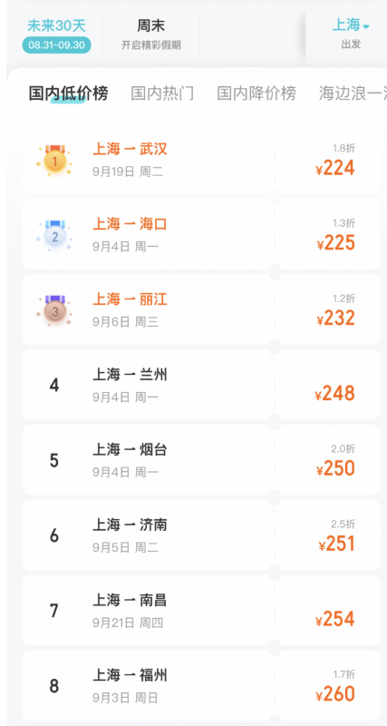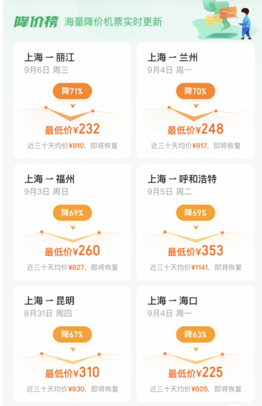 在“去哪儿网”平台可以看到,上海飞往福州、兰州、昆明、海口、丽江等多条航线的机票价格下降明显,其中,9月6日上海飞往丽江的机票更是低至232元。