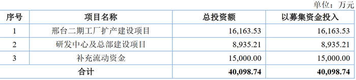 数据显示,纳科诺尔本次拟募资4.01亿元。根据安排,本次所募资金扣除发行费用后,将用于邢台二期工厂扩产建设项目、研发中心及总部建设项目以及作为补充流动资金。具体来看:
