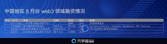 如上图所示,中国市场Web3领域8月份只有4个项目获得融资,它们分别是:
