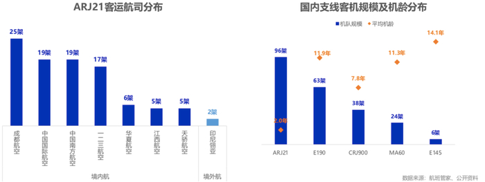 航班管家提供给出行一客(ID:carcaijing)的数据显示,从机队规模上来看,中国产的ARJ21已超过巴航工业的E190(不含E195 ),占支线机队总量的43.4%,成为国内支线飞机主力军,同时机队机龄也更加年轻化,平均仅2年。