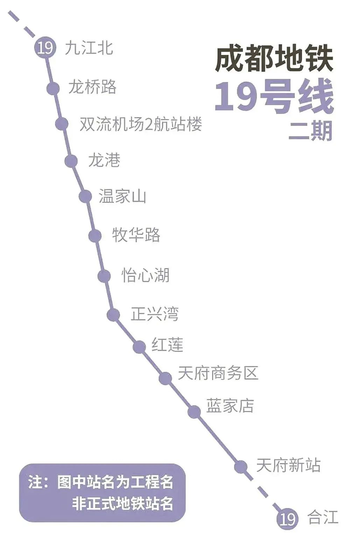 全长约42.87公里的19号线二期工程集市域通勤快线及双机场快线功能为一体,衔接成都双流国际机场和成都天府国际机场两个门户枢纽,共设12个车站,全部为地下线。
